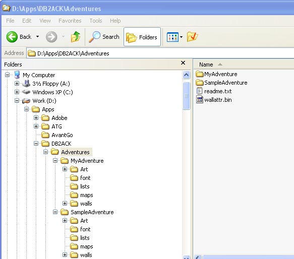 Each adventure consists of a set of files and directories. The "My Adventure" that we are about to create will start out as a clone of the "Sample Adventure" included with the DB2ACK.