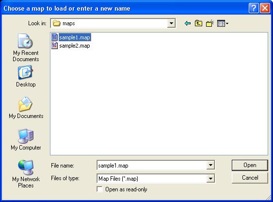1) Load SAMPLE 1 map into mapeditor programUnder the Windows "Start" button, select "Programs" -> "DB2ACK" -> "Mapeditor". A file requester should appear, prompting you for either an existing map file to edit, or a new map filename to create. In this case, we want to edit SAMPLE 1 so navigate the path to your DB2ACK/Adventures/MyAdventure/Maps directory, and select "sample1.map", as in Figure 15, and hit "OK".