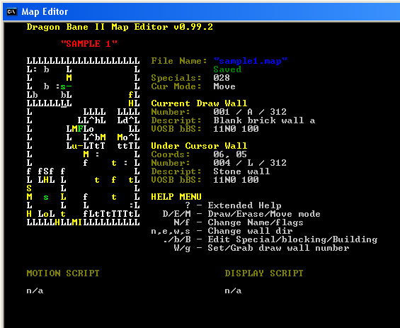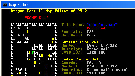 In this step, we are going to modify a generic stone walls at location (0,10). Note that your cursor's coordinates are listed under the "Under Cursor Wall" section. Using the cursor keys, move your underline cursor to square (0, 10). You should see that the "Under Cursor Wall" at that position is described as wall #4, or a "Stone wall". This description information all comes from a wall description file that you can edit, but is beyond the scope of this tutorial.