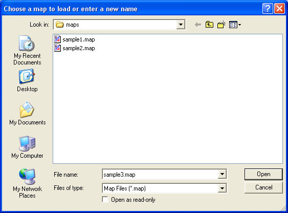 1) Create a new mapRun the mapedit program as before, by going to the Start menu, and selecting Programs -> DB2ACK -> Mapeditor. When the file requester appears, navigate to the DB2ACK/Adventures/MyAdventure/maps directory, and you should see your existing two maps listed. In the "File Name:" field, enter our new map name, "sample3.map", as in Figure 18, below.
