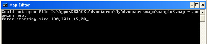 Click the "Open" button to dismiss the file requester, and the mapeditor console window benieth it will ask you for the dimensions of your new map. You may enter "15,20" to get a map that is 15 wide and 20 high, as in Figure 19.