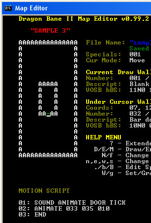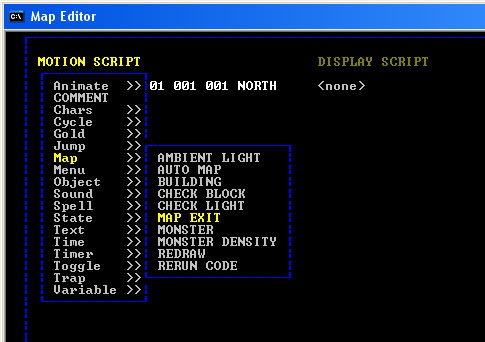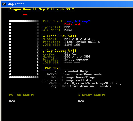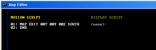 At this point, we have created a force field wall, now it is time to add instructions to that wall to teleport the party. But first, it is necessary to learn a few simple instructions for editing mapspecial code. Don't do it just yet, but to edit a MOTION SCRIPT or DISPLAY SCRIPT for the wall under your cursor, you will press the period key, '.'. This will open a new window and places your cursor at the first line of the MOTION SCRIPT. In this script editor, the following keys may be used: