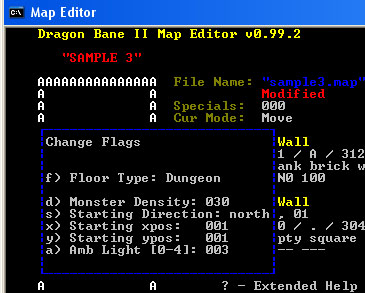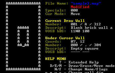 Save and exit the mapeditor. Copying and pasting walls not only makes map editing easy and less prone to human error, but it can be very helpful when you want to learn how to program a specific type of square that is available in one of the "Sample Adventure" maps (who's complete list of mapspecials is provided here. You can store up to 26 separate named wall buffers in letters 'a'..'z' plus a map region buffer described in the mapeditor documentation. One thing to watch out for when copying and pasting between maps is that you cannot have two or more mapeditor windows open at the same time when copying walls to named buffers. Only the first mapeditor window opened is able to write to these buffers, so attempting to copy a square from the second mapeditor window will fail. It is best to only have one mapeditor window open at a time when doing this type of editing.