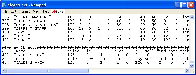 ####New Objects########################################################################################################################################################## # Name tile# lev u drop ID buy sell find shop mask det req_attrib min bonus val type code Accur 403 "CALEB'S KEY" 156 0 1 0 0 0 0 0 0 0 0 strength 0 intelligence 0 Misc 1 0 # Name Tile Lev Uniq drop ID buy sell find shop mask det attrib val bonus val type phys fire magic special accuracy 404 "CALEB'S AXE*" 125 3 1 1 0 100 0 0 0 64 0 strength 20 strength 2 HandWeapon 10 0 0 0 1
