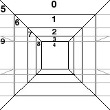 All walls are defined by individual "wall.txt" data files that reside in your DB2ACK/Adventures/MyAdventure/Walls directory. There you will find three subdirectories separating walls that were designed for the outdoors, towns, and dungeons. Each of these wall files is composed of a few fields to describe some attributes (described in detail in the wall section of the documentation) of the wall followed by a set of "views" which must be constructed for each of the 10 possible angles you can view a wall. Only front views, left views, and far-left views are defined in a wall.txt file; all right, and far-right views are automatically constructed by the DB2 engine at run-time by horizontally fliipping the left walls. Figure 37 shows the 10 wall views (numbered 0-9) that are defined in each wall file.